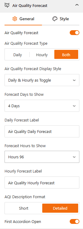 - Air Quality Forecast Type: Select whether to display Daily, Hourly, or Both forecast data.
