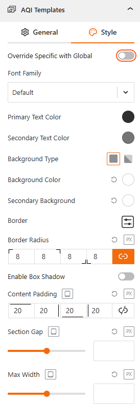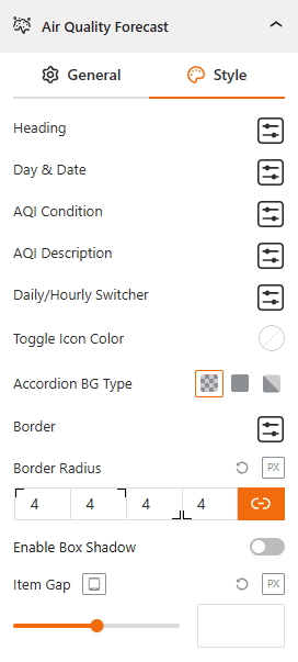 - Typography: Customize the font family, color, size, and weight for the Heading, set Vertical Gap, Day & Date, and AQI Condition & Description text.