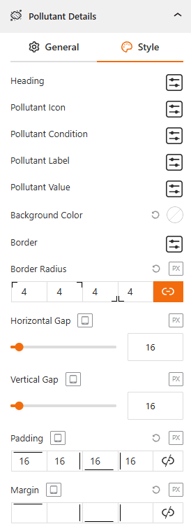 - Padding & Margin: Set custom padding & margin to control the spacing between the pollutant section and other block elements.
