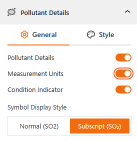 The Pollutant Details panel gives you complete control to fine-tune how specific pollutant data is presented to your visitors, ensuring technical accuracy and visual clarity.