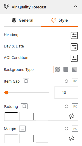 - Typography: Customize the font family, color, size, and weight for the Heading, Day & Date, and AQI Condition text.