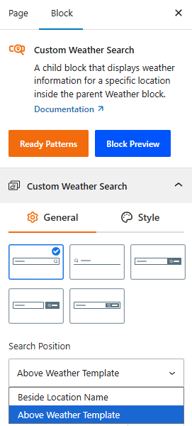 - Search Position: Select where the search bar will be displayed relative to the weather block, such as “Beside Location Name” and “Above Weather Template”.