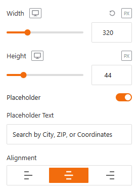 - Placeholder Text: Customize the text that appears in the search bar when it is empty, such as “Search by City, ZIP, or Coordinates”.