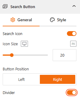 - Divider: Use this toggle to enable a vertical line that visually separates the search button from the search input field.