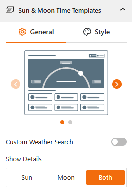 - Custom Weather Search: Use this toggle to enable a front-end weather search bar, allowing users to look up sun & moon phase for different locations.