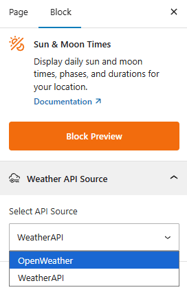 - Click the (+) button to add a new block and search for “Sun & Moon Times”.