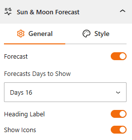 - Show/Hide Heading Label: Use the toggle to enable or disable the Mon & Sun Times heading label from here.
