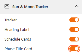 - Show/Hide Phase Title Card: Use the toggle to enable or disable the Mon & Sun Times phase title from here.