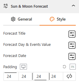 From this style panel, you will be able to add style to the Sun & Moon Times Template Typography and set spacing as you need.
