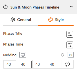 From this style panel, you can add style to the Key Sun & Moon Phases Timeline Typography and set spacing as you need.