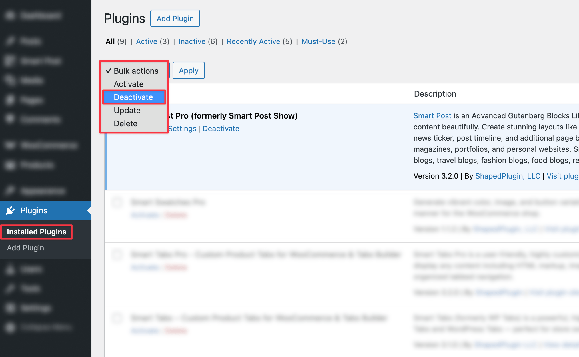 Once you’ve finished backing up your site, go to the Plugins page. There, you’ll need to select all your plugins except Location Weather. Then open the Bulk Actions dropdown at the top of the page and choose Deactivate.