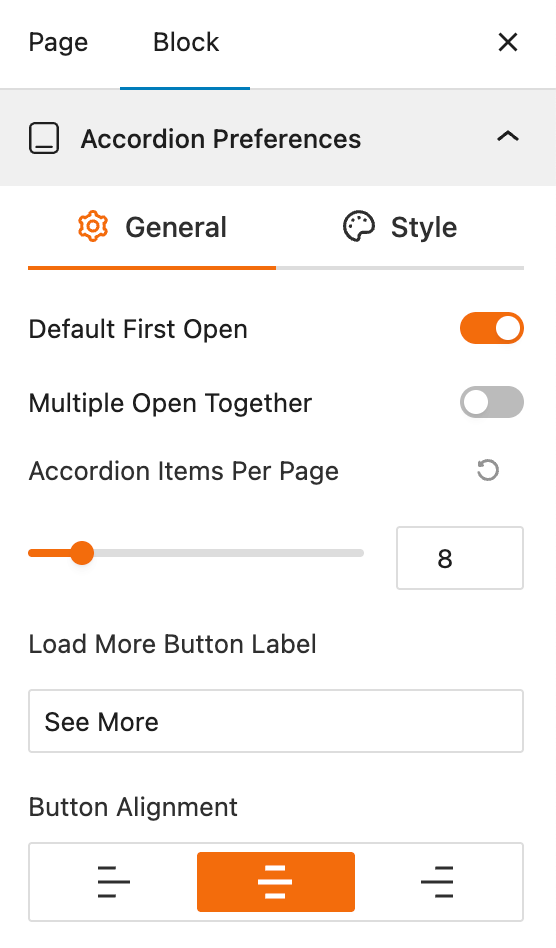 - Accordion Items Per Page: A slider to set the number of accordion items to be displayed initially.