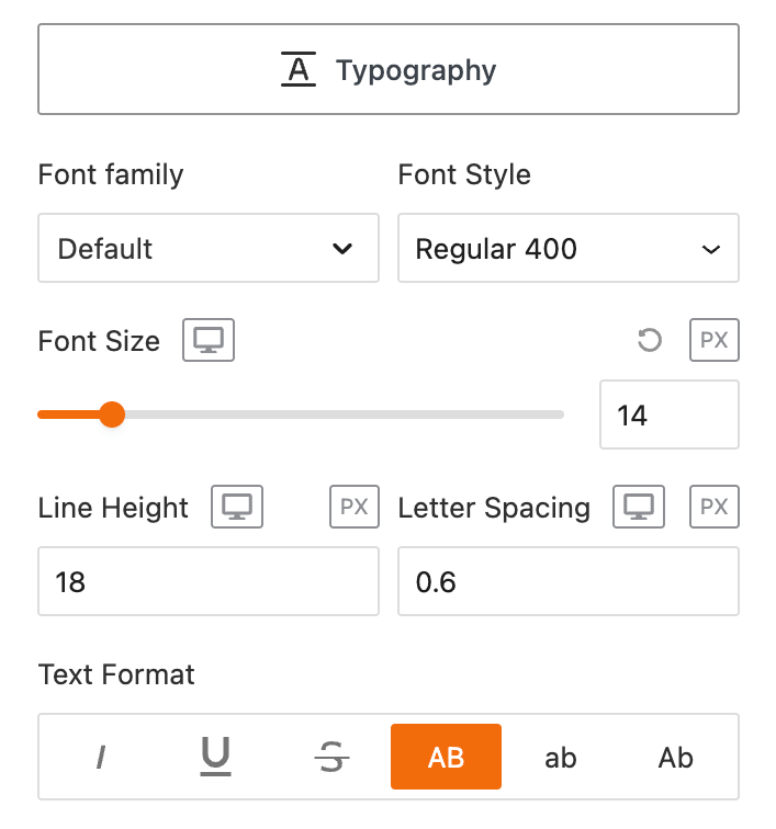 - Font Family: A dropdown selector for choosing the typeface used throughout the accordion elements, with “Default” inheriting from the theme for seamless integration.
