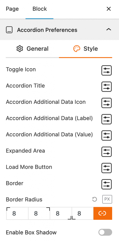 - Enable Box Shadow: A toggle to add a shadow effect to the accordion block.