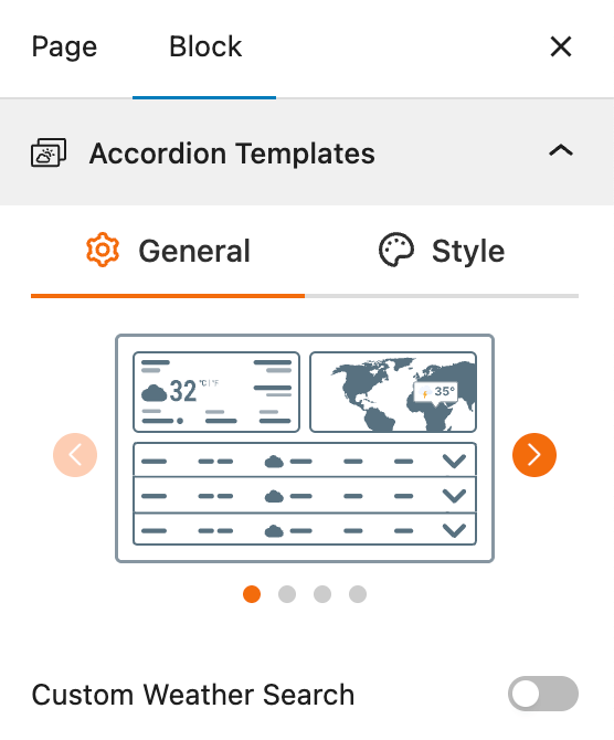 This section allows you to select a pre-designed template for the Weather Accordion block. By choosing from a variety of layouts, you can easily change the look of your accordion to match your website’s design without any custom coding.