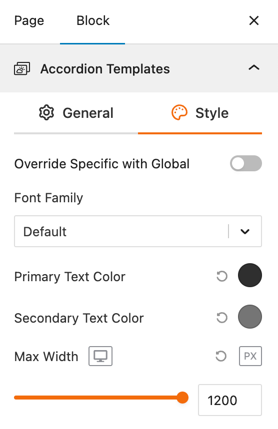 - Override Specific with Global: A toggle that enables overriding the block’s individual style settings with global theme styles, ensuring site-wide consistency without manual tweaks.