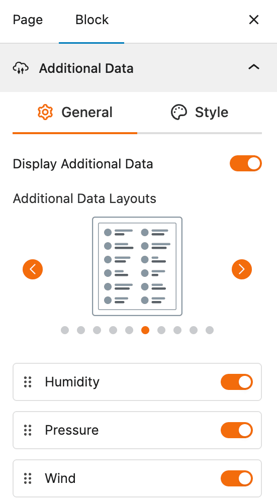 This section gives you complete control over the supplemental weather information you want to display in your block. You can choose from various data points and customize their layout to provide a detailed weather overview for your visitors.
