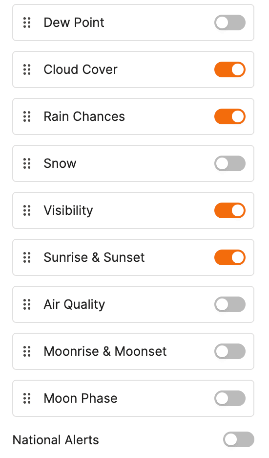- Individual Data Toggles: A list of toggles to show or hide specific data points such as Humidity, Pressure, Wind, Dew Point, Cloud Cover, Rain Chances, Snow, Visibility, Sunrise & Sunset, Air Quality, Moonrise & Moonset, and Moon Phase.