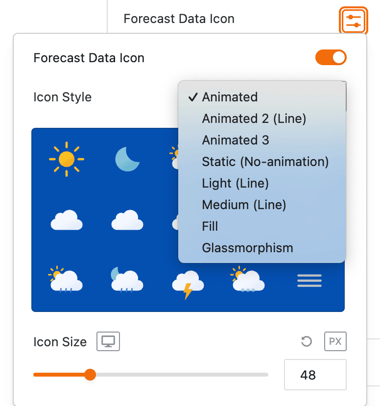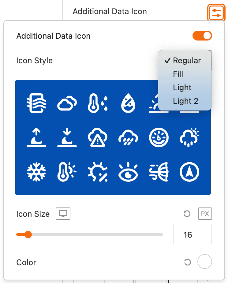 - Forecast Data Icon: Provides a settings icon to open additional style options for the icon associated with each data point.
