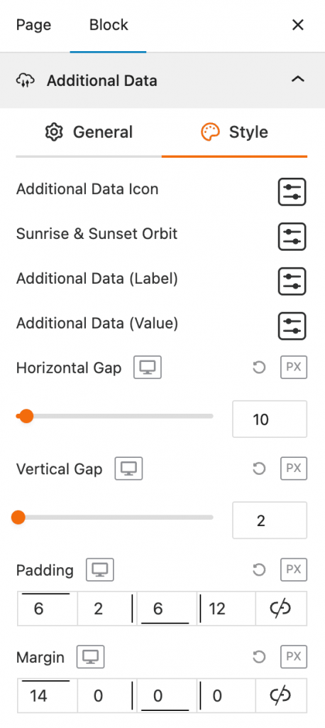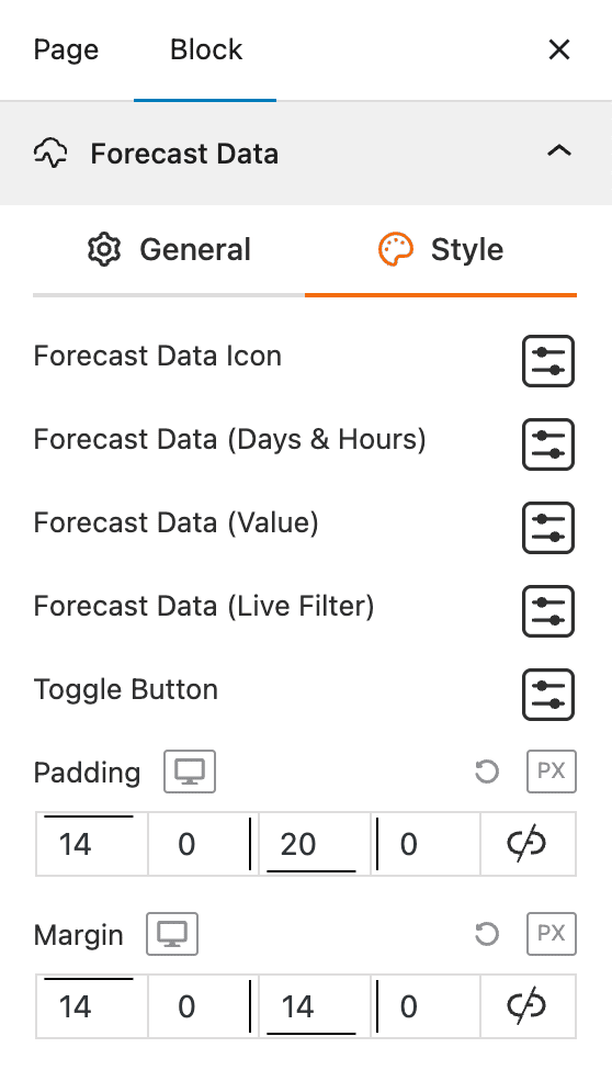 This section gives you precise control over the styling of each element within the Forecast Data section. You can customize the appearance of icons, labels, and values to ensure they are visually consistent with your website’s design.