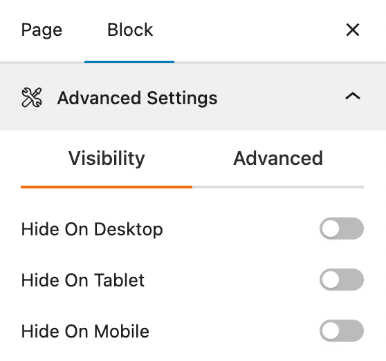 This section allows you to control the visibility of the block across different device types. You can choose to show or hide the block on desktops, tablets, or mobile devices to optimize the user experience for each screen size.
