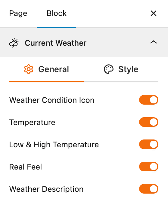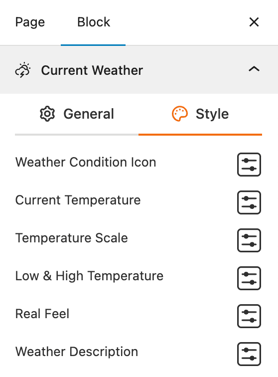 - Current Temperature: Provides a settings icon to open additional style options for the current temperature, such as typography and color.