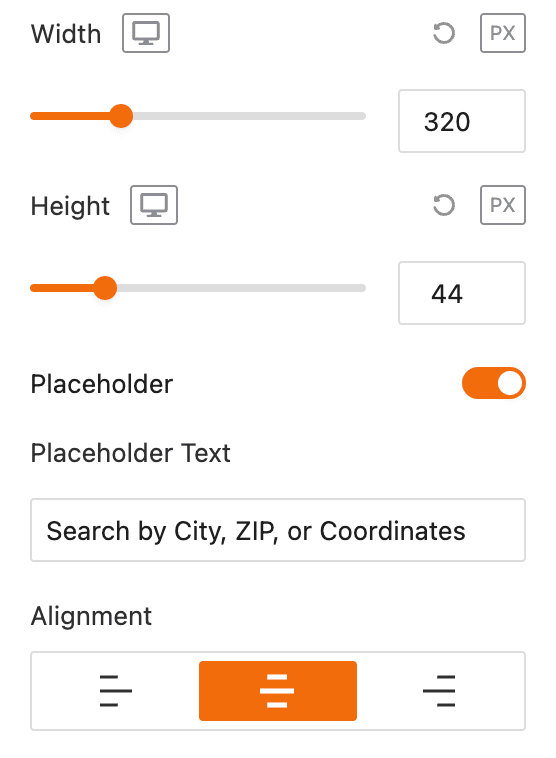 - Placeholder Text: Customize the text that appears in the search bar when it is empty, such as “Search by City, ZIP, or Coordinates”.