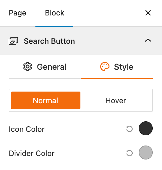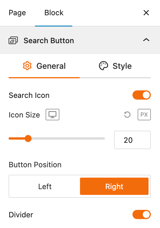 - Divider: A toggle to enable a vertical line that visually separates the search button from the search input field.