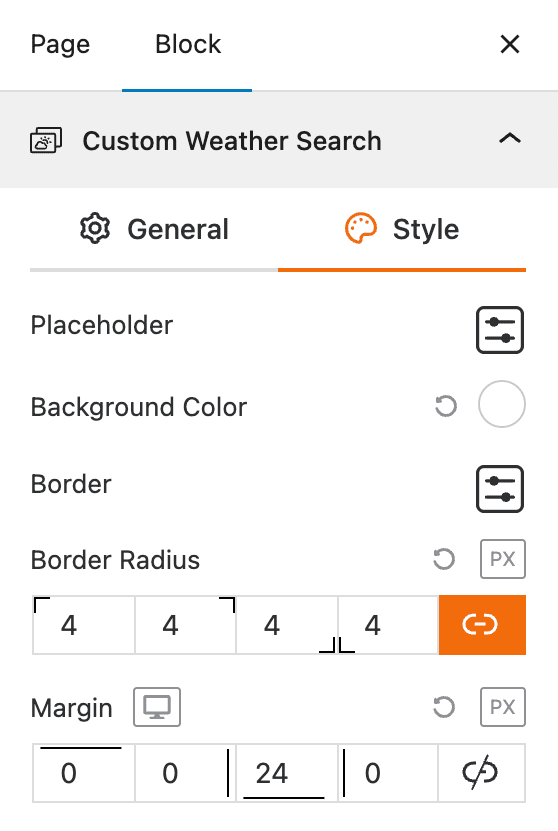 - Custom Weather Search Field: Provides a settings icon to open additional style options for the search input field.