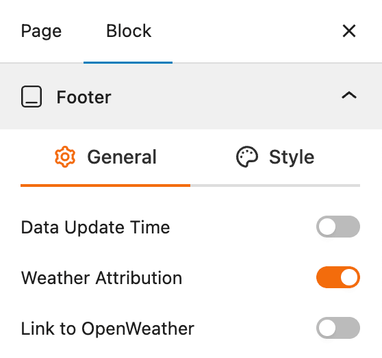 This section allows you to control the display of information in the block’s footer, such as the data update time and weather attribution.