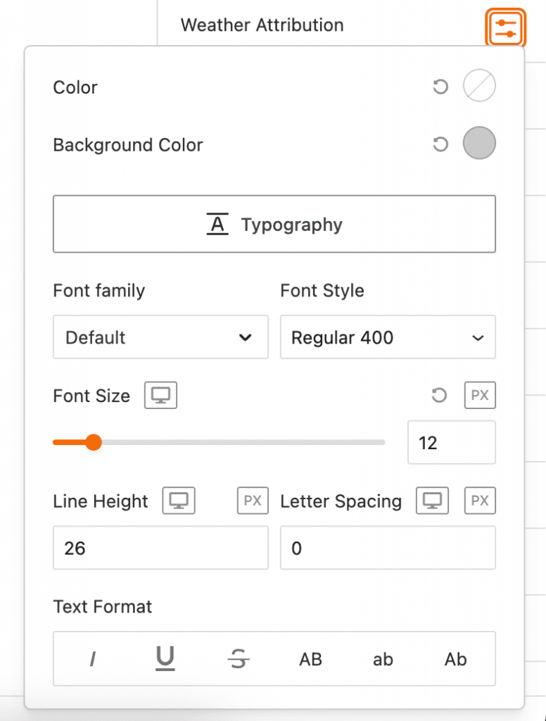 This section allows you to customize the typography and appearance of the weather attribution text, ensuring it is styled to match your website’s design.