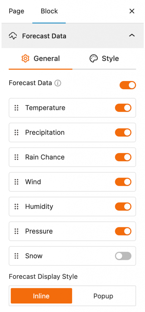 - Forecast Display Style: Choose between an “Inline” display or a “Popup” display for the forecast data.