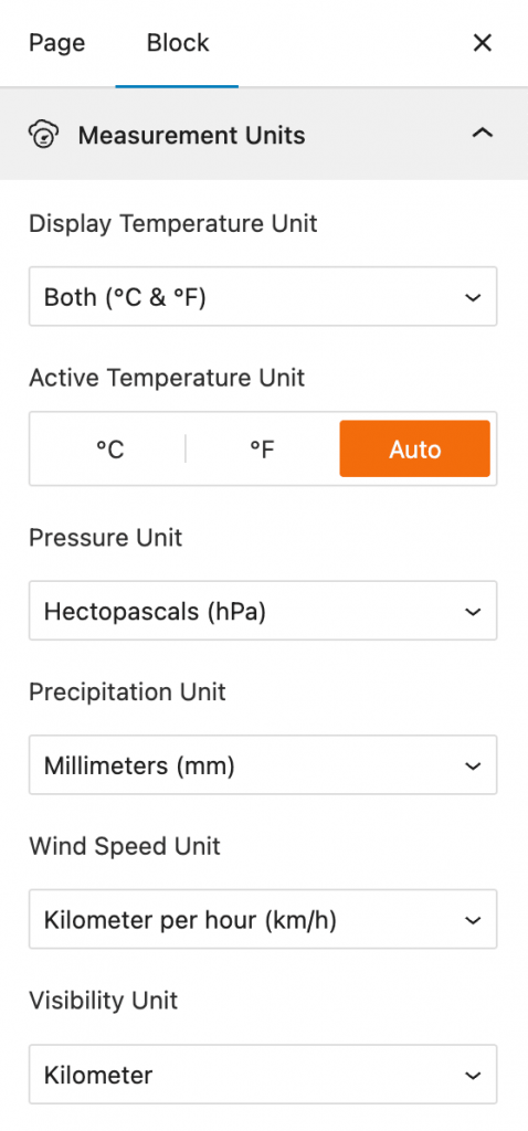 This section allows you to customize the units used to display weather data in the Location Weather block. You can choose the standard units that best suit your target audience and location.
