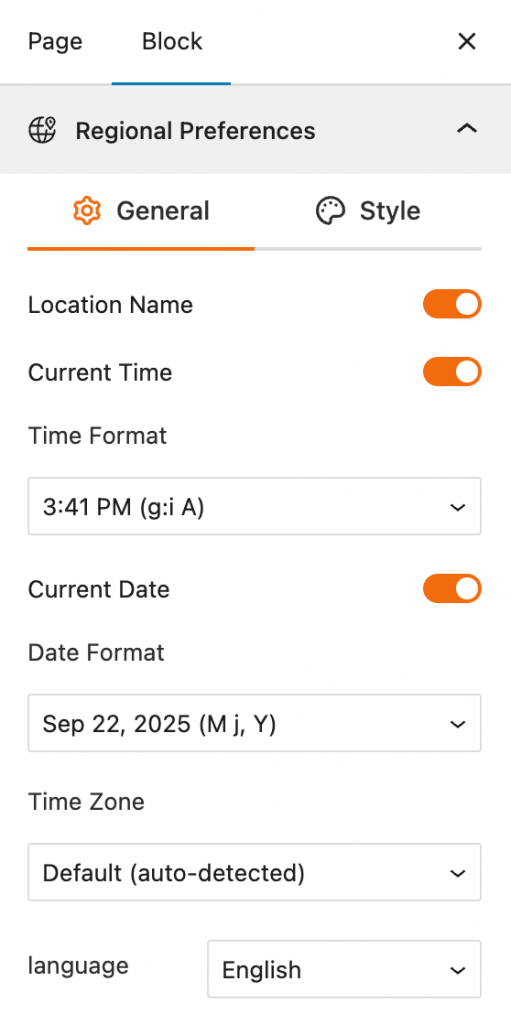 This section gives you control over the styling of the displayed location, date, and time elements, allowing you to match the block’s appearance with your website’s design.