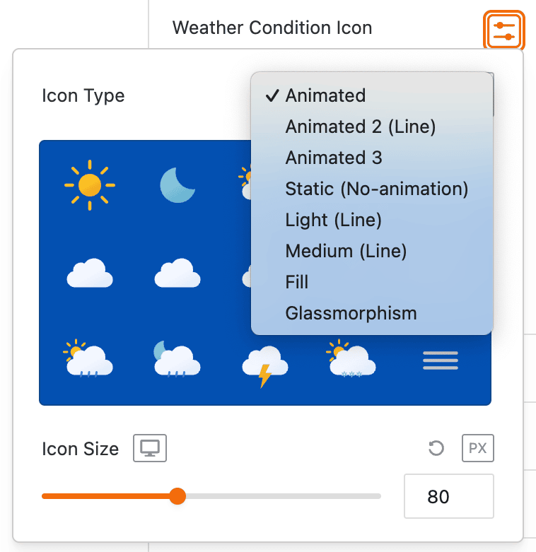 - Weather Condition Icon: Provides a settings icon to open additional style options for the weather icon, such as Icon Type and Size.