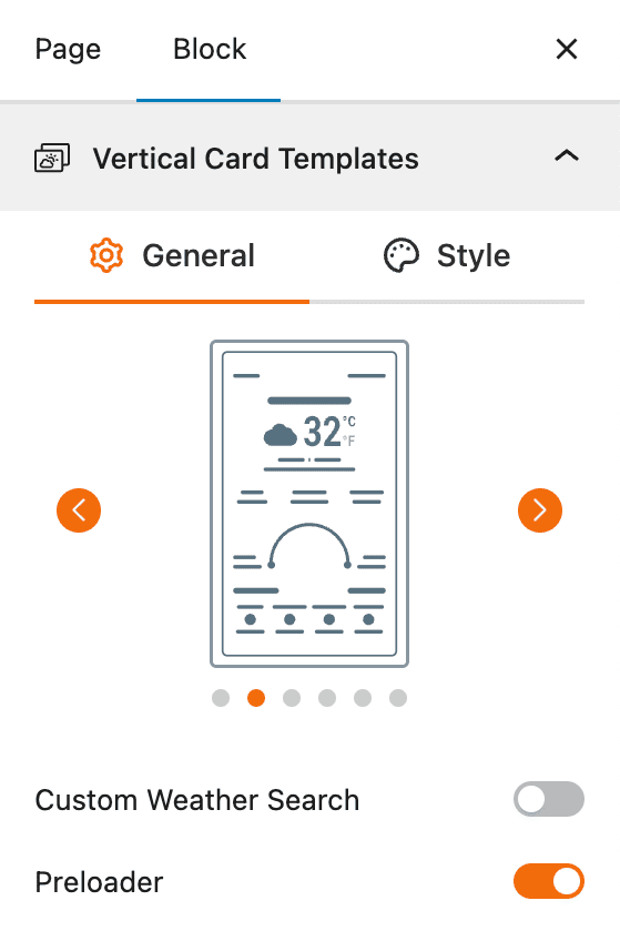 This section lets you choose from multiple pre-designed weather card layouts and control how the block behaves on your site.