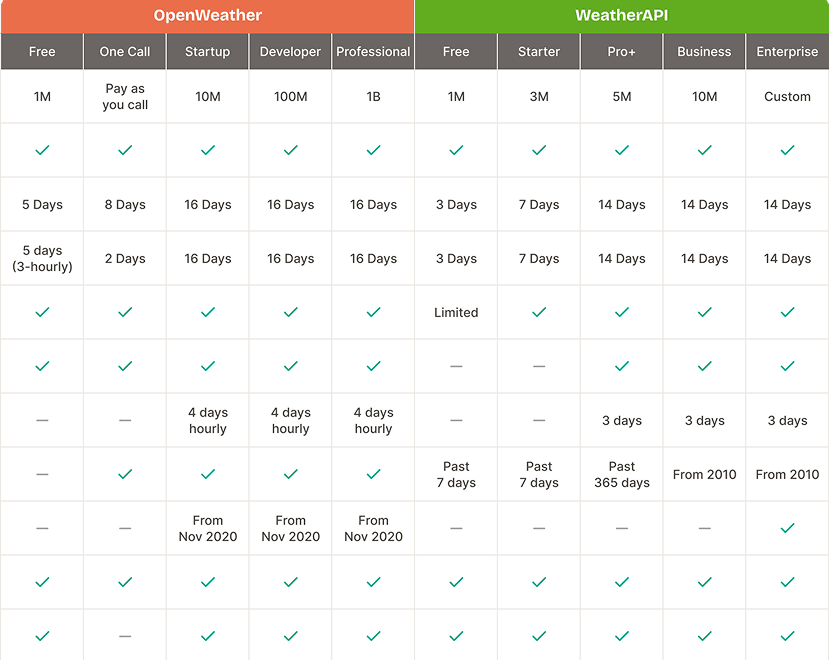 This guide explains the weather data availability across different subscription plans offered by OpenWeatherMap and WeatherAPI. It helps you understand which data points and features are included in each tier, so you can confidently choose the right plan and ensure it supports the required blocks and functionality for your weather interface.