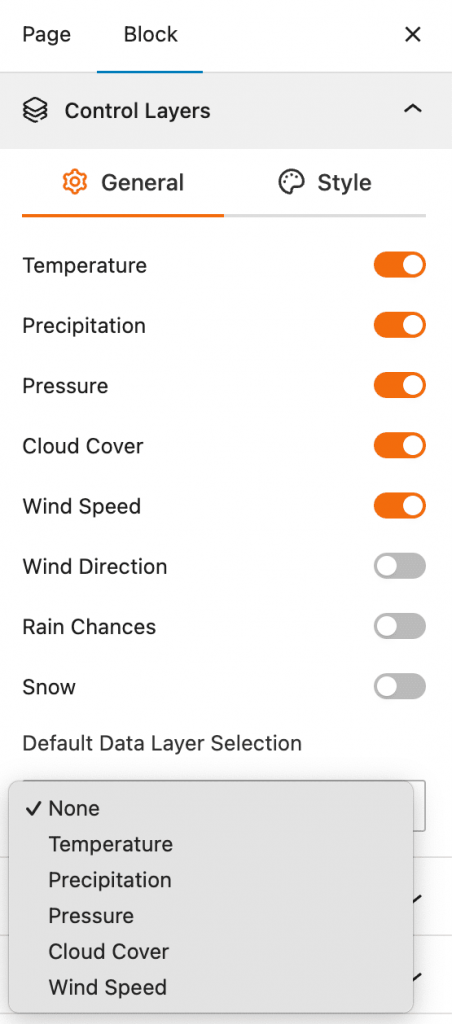 - Data Layer: Provides advanced style controls for the weather data layers.