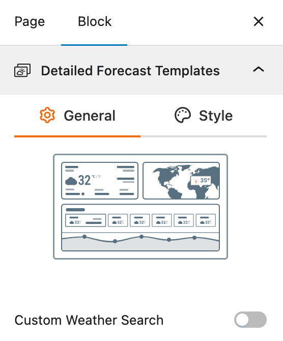 This section allows you to choose from various pre-designed templates for the Detailed Forecast block. This provides a quick and easy way to change the overall layout and design of your weather forecast display.