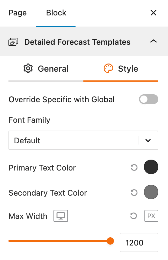 This section gives you control over the visual appearance of the selected Detailed Forecast template. It allows you to customize the typography and color of the text to ensure the block is visually consistent with your website’s design.