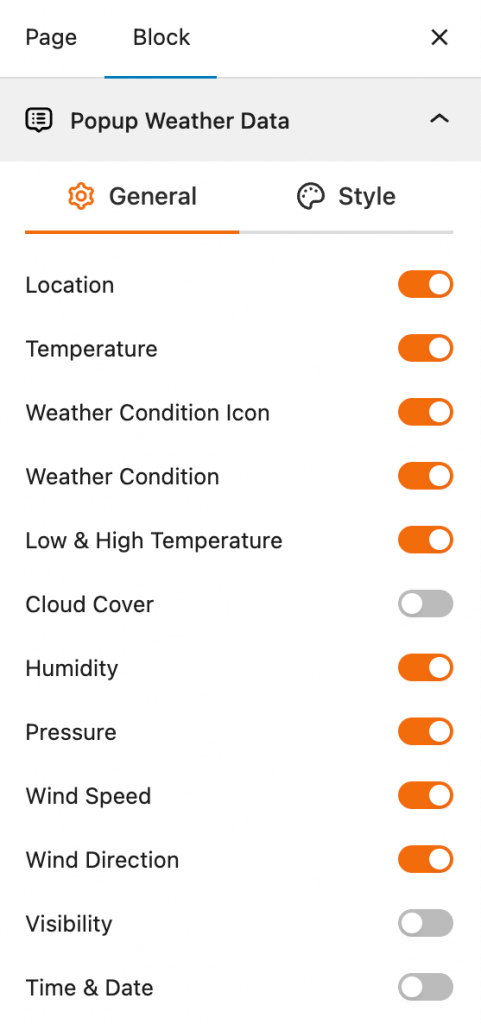 This block section allows you to control which pieces of weather data are displayed in the popup when a user interacts with the map. You can customize the information shown for a specific location by enabling or disabling various data options.