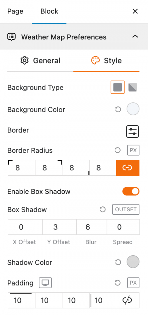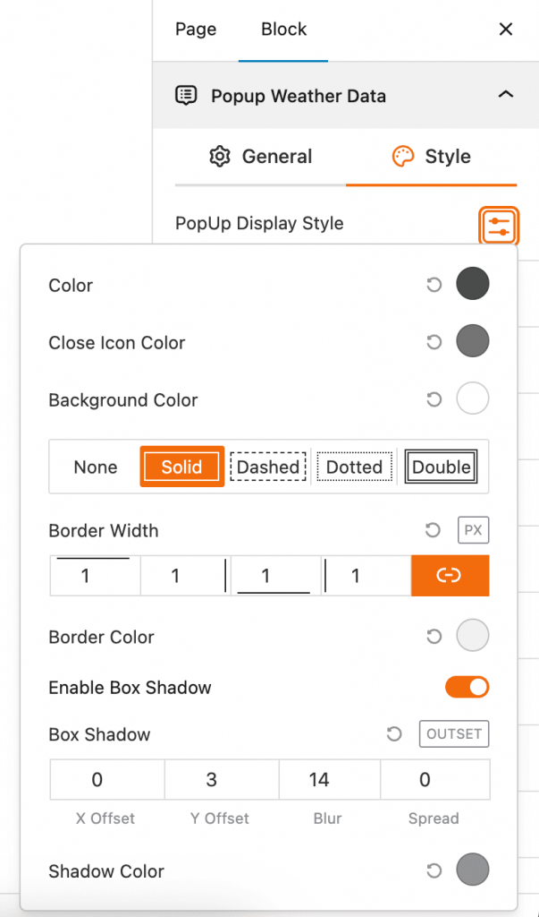 This block section allows you to control the visual style of the weather data popup. You can customize the colors, borders, and shadows of the popup window that appears when a user clicks on the map.