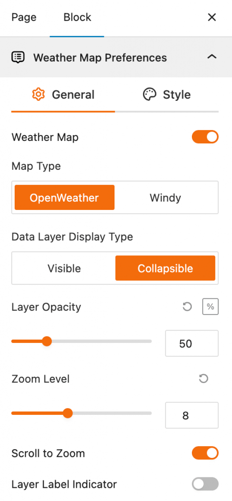 This block section is designed for controlling which weather data layers are available to be displayed on the map. It allows you to enable or disable specific weather data types and set a default layer.