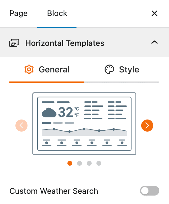 This section allows you to select from a variety of pre-designed horizontal templates for your weather block. This provides a quick and easy way to change the overall look and feel of your weather display to fit your website’s design.