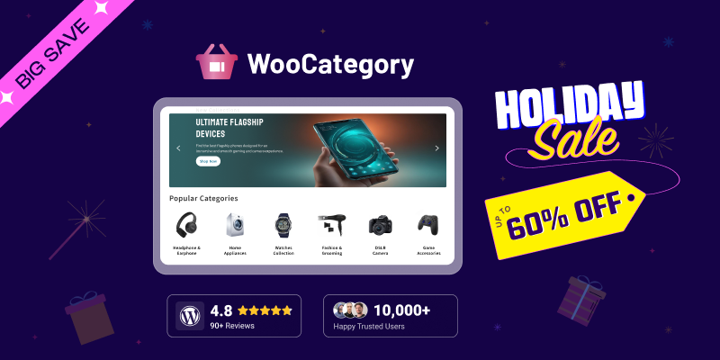 WooCategory is an ultimate product category plugin that lets you create beautiful product categories in stunning grids, sliders, and carousels in minutes. Display your products in attractive, interactive, and easy-to-navigate category showcases that simplify product discovery and boost sales.